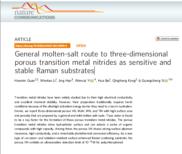 近日,百家乐模拟器 孔庆红副教授团队与中国质检局席广成研究员团队合作,在nature communications杂志上发表最新研究成果“General molten-salt route to three-dimensional porous transition metal nitrides as sensitive and stable Raman substrates”,论文的第一作者为百家乐模拟器 2018级安全工程的管皓敏硕士,指导老师孔庆红副教授。