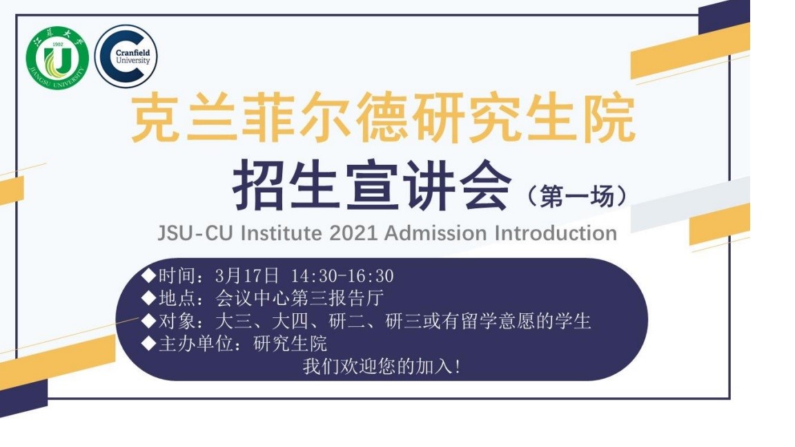 内容简介:江苏大学克兰菲尔德未来技术研究生院(以下简称克兰菲尔德研究 生院)是经教育部批准设立的研究生教育中外合作办学机构,由江苏大学和英国 克兰菲尔德大学合作举办。克兰菲尔德研究生院2021年3月开始第一期招生,2021年9月正式开学。为增进广大师生对相关博士、硕士项目的了解,研究生 院特此举办招生宣讲会,具体将针对招生项目、招生计划、培养模式、课程模式、 中英导师联合指导模式、毕业要求、学历与学位认证、学费收取等内容进行宣讲, 并现场解答师生的相关问题。