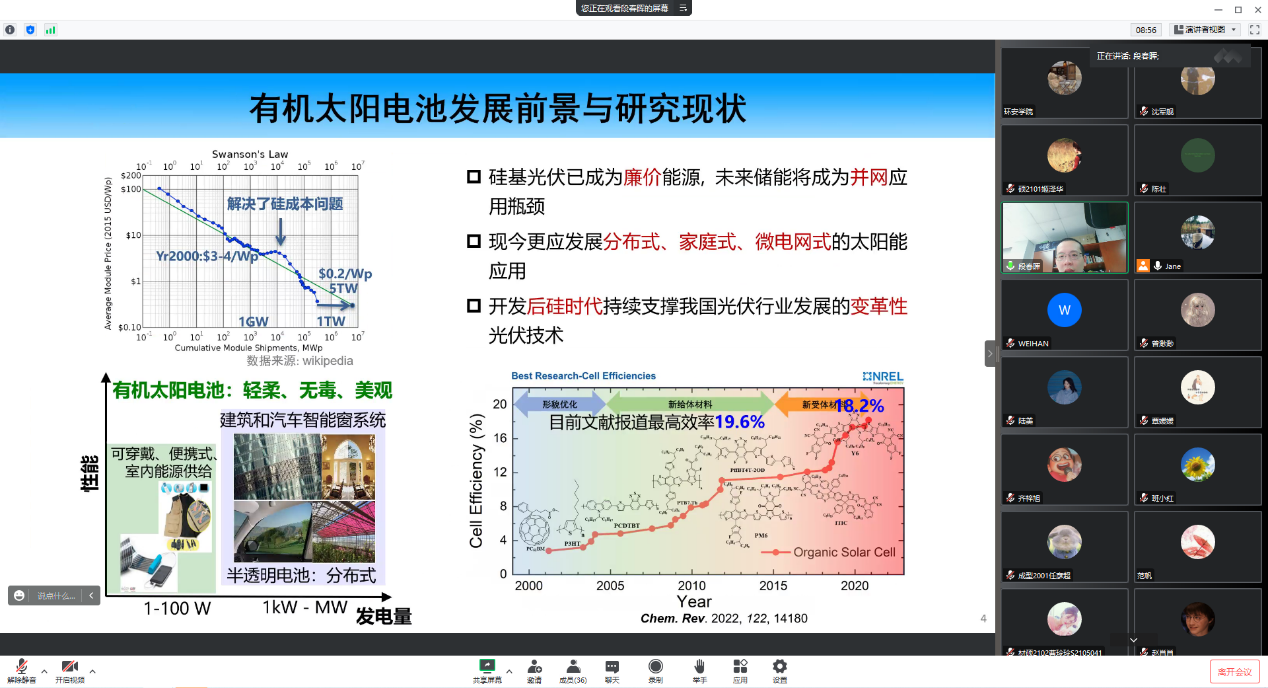 师生开展题为“高性能低成本有机太阳电池关键材料研究”的学术报告。报告会由研究院徐婉珍院长主持,环境、材料、化学、机械、电气等相关专业的教师和学生参加了此次学术报告会。