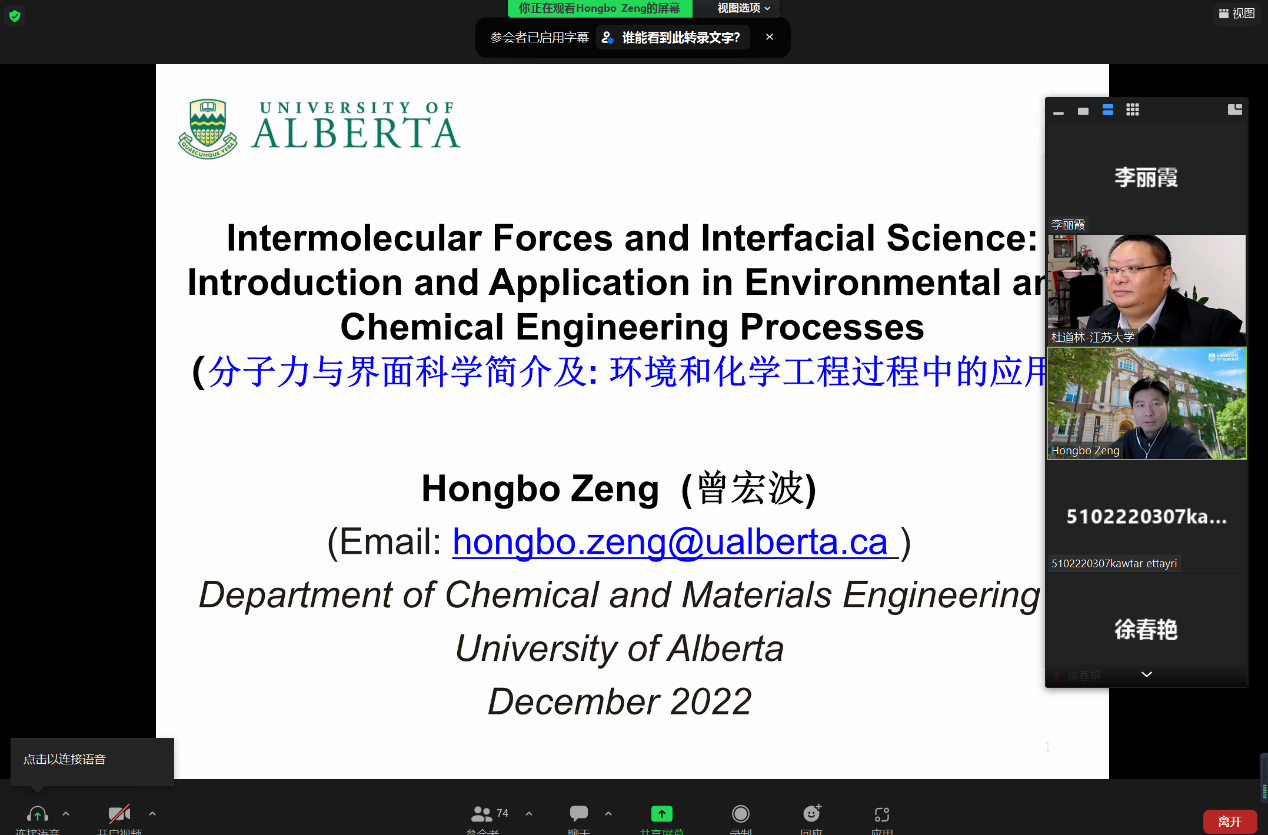 12月15日,阿尔伯塔大学化学工程和材料工程系终身教授、加拿大工程院院士、国家讲席教授、加拿大皇家科学院青年院士曾宏波受邀为院师生做题为“分子力与界面科学简介及在环境和化学工程过程中的应用”讲座。百家乐模拟器