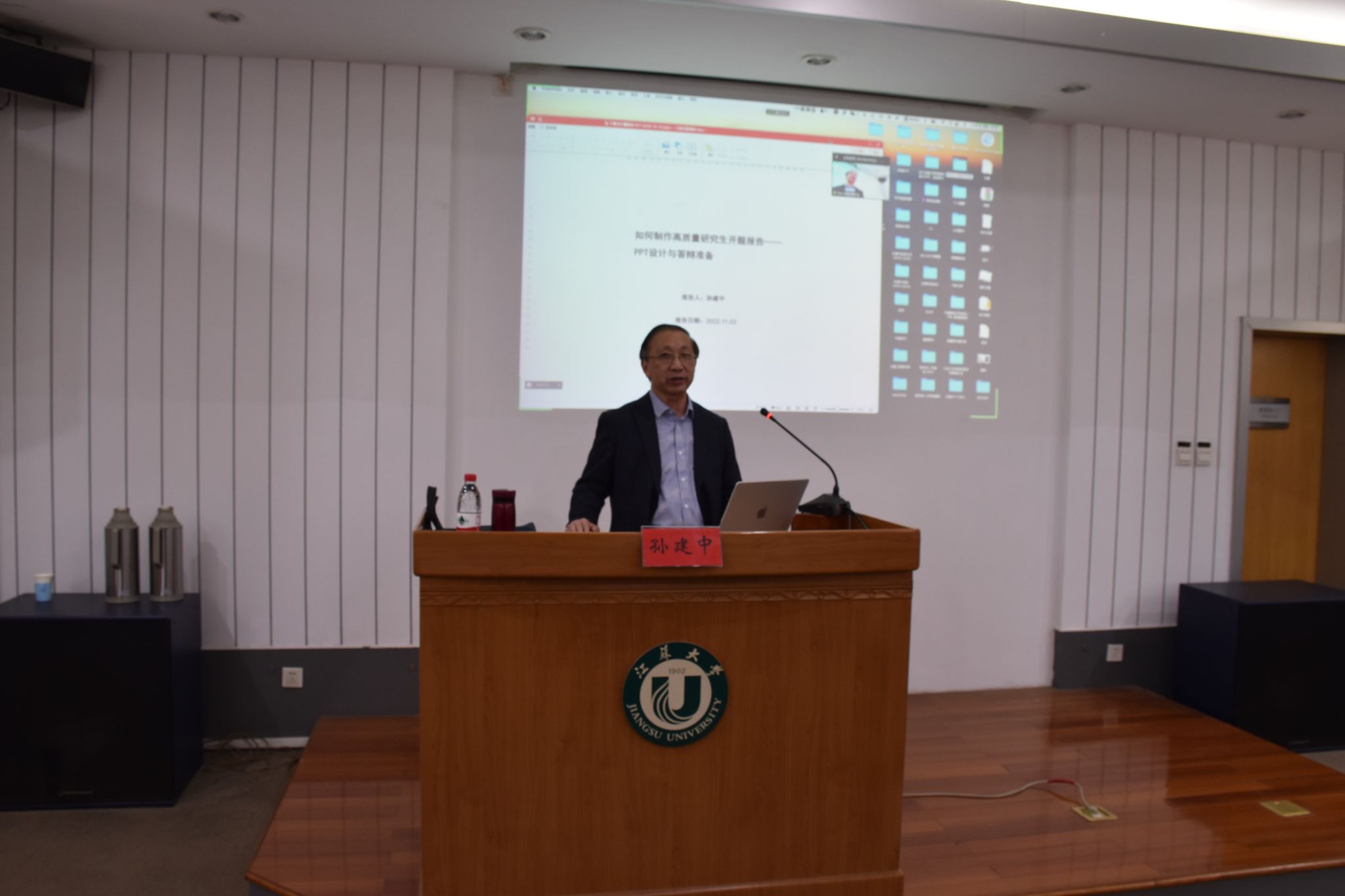 孙建中教授为同学们做了题为《如何制作高质量开题报告—PPT设计与答辩准备》的报告,活动采取线上线下进行的方式,学院各年级共150余名学生参加。