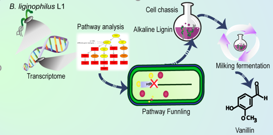 木质素作为自然界最为丰富的可再生芳香化合物资源,缺少高效生物转化和资源化利用途径一直是限制其高值利用的主要瓶颈。针对该关键问题,研究阐明了嗜碱芽孢杆菌B. ligniniphilus L1 中木质素解聚合成香草醛的代谢网络,通过木质素预处理策略和代谢途径改造,将香草醛的发酵效价提高了28倍。并且开发了一种循环发酵的新方法消除香草醛细胞毒性对发酵的影响。本研究为从木质素中生产天然香兰素开辟了一条新途径,为木质素废弃生物质资源的高值化利用提供了新思路。