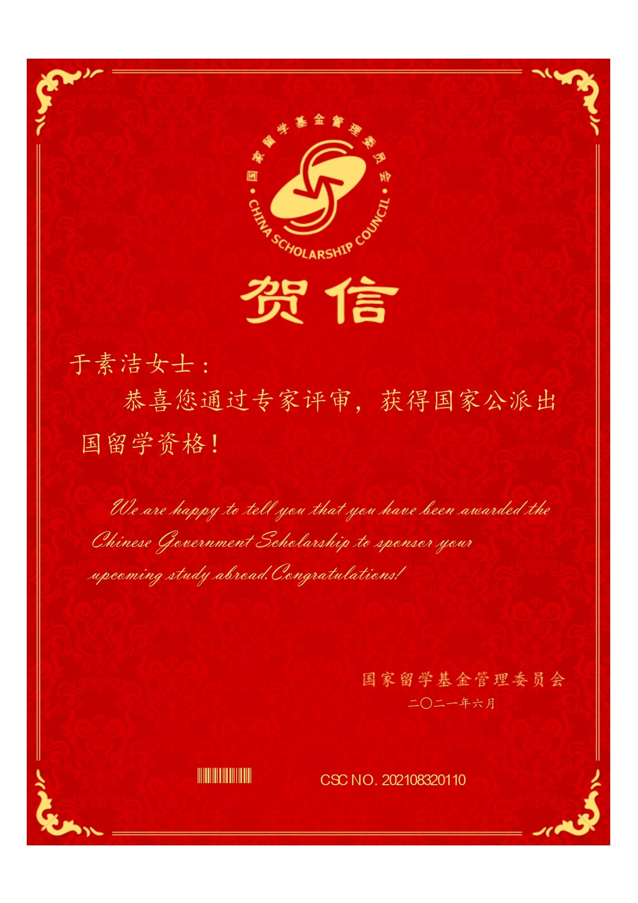 2018级硕士研究生于素洁获得全额奖学金攻读博士学位的留学资格。