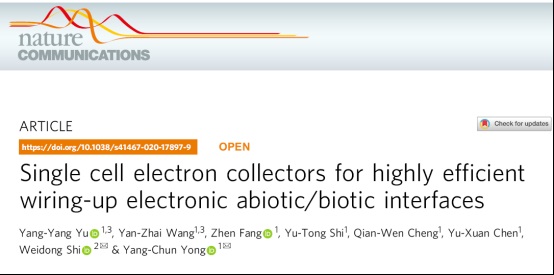 生物质能源研究院雍阳春教授课题组与化学化工学院施伟东教授课题组合作,在《自然-通讯》杂志(Nature Communications)在线发表了题为“Single cell electron collector for highly efficient wiring-up electronic abiotic/biotic interface”的研究论文。该工作完全由江苏大学自主独立完成,江苏大学为该论文唯一完成单位。