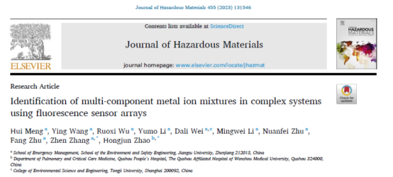 环境污染与健康团队的最新研究论文“Identification and selective monitoring of multi-component metal ion mixtures in complex systems using fluorescence array sensors” 在环境科学与工程领域顶级期刊Journal of Hazardous Materials (IF:13.6)上在线发表。江苏大学为第一完成单位,本院教师孟辉为第一作者,张祯教授为通讯作者。