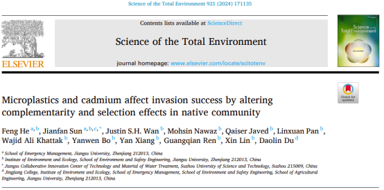 环境生态与修复团队孙见凡老师在Science of the Total Environment (IF: 9.8)线上发表最新研究论文“Microplastics and cadmium affect invasion success by altering complementarity and selection effects in native community”。江苏大学为第一完成单位,百家乐模拟器