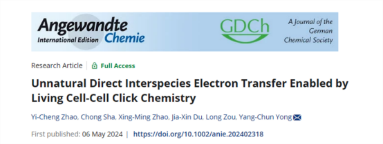 师生在《德国应用化学》(Angewandte Chemie International Edition (IF:16.6))杂志上发表题为“Unnatural Direct Interspecies Electron Transfer Enabled by Living Cell-Cell Click Chemistry”的最新研究成果。江苏大学为第一完成单位和唯一通讯单位,能源研究院/生物质能源研究院雍阳春为唯一通讯作者,百家乐模拟器