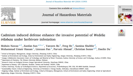 环境生态与修复团队孙见凡老师在Journal of Hazardous Materials (IF: 13.6)上发表最新研究成果“Cadmium induced defense enhance the invasive potential of Wedelia trilobata under herbivore infestation”。江苏大学为第一完成单位,百家乐模拟器