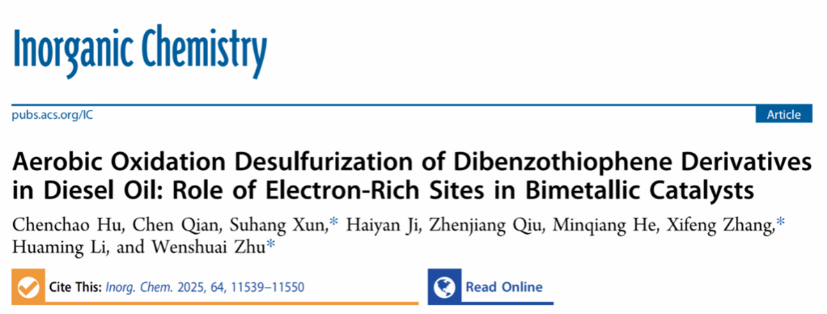 最新研究论文“Aerobic Oxidation Desulfurization of Dibenzothiophene Derivatives in Diesel Oil: Role of Electron-Rich Sites in Bimetallic Catalysts”在《Inorganic Chemistry》(Nature Index,SCI一区)期刊发表。江苏大学为第一完成单位,本院教师荀苏杭副研究员、化工学院张锡凤副教授和朱文帅教授为共同通讯作者。
