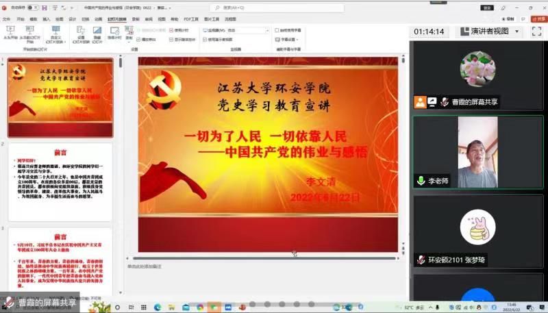党委积极推动党史学习教育常态化长效化,6月22日,线上开展专题宣讲活动,邀请校党的创新理论宣讲团成员、校关工委副主任李文清教授,为学院师生党员和入党积极分子进行党史学习教育。宣讲会由学院党委书记黄勇强主持。