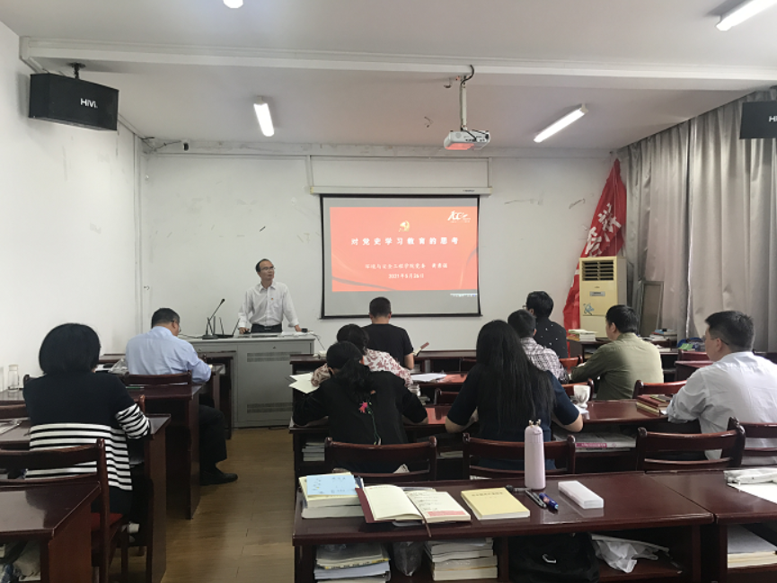 专题党课中,配合图文并茂的PPT课件,黄勇强谈了自己对开展党史学习教育的一些思考,阐明了为何学、学什么、怎么学,重点探讨了党史学习教育如何融入师生思想政治教育、课程思政。他认为应聚焦四个“讲清楚”:要学史明理,讲清楚进程与立场;要学史增信,讲清楚自信与力量;要学史崇德,讲清楚精神与信仰;要学史力行,讲清楚实践与方法。