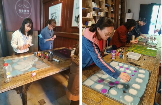秋日午后的阳光暖暖的,温暖舒适;宜园金黄的桂花香香的,沁人心脾。女教师们伴着秋风花香迈进了有宜书房的大门,在工作人员的讲解后,迅速投入了丝巾的创作。有的采用蓝绿的冷色,有的采用粉红的暖色,色彩堆砌、重叠、交融,勾勒出一幅幅个性十足、绚丽多彩的丝巾作品。