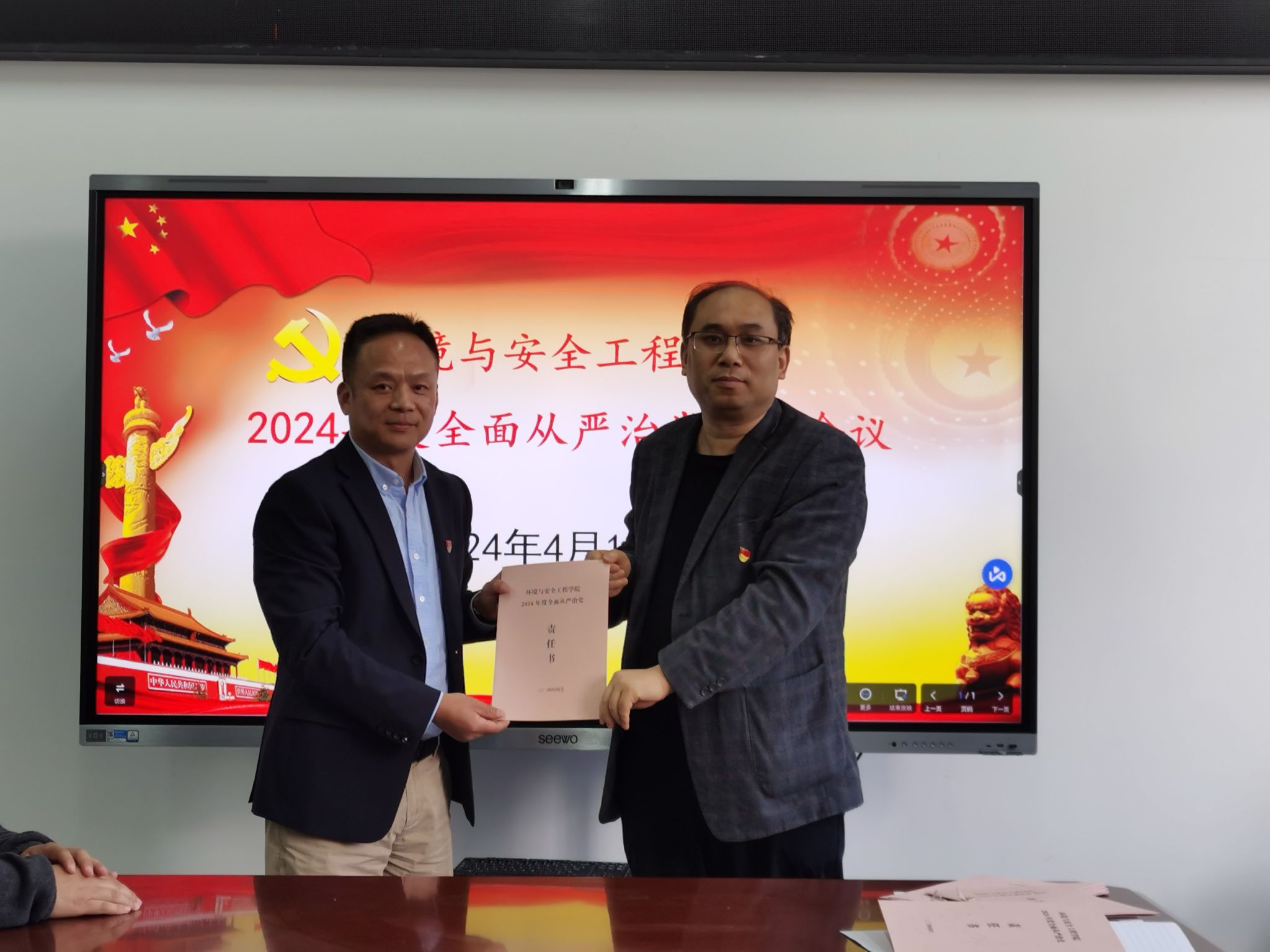 2024年度落实全面从严治党党委主体责任清单》。领导班子代表、教职工党支部书记代表、学生党支部书记代表分别向院党委递交了2024年度全面从严治党主体责任书。学院党委副书记兼纪检委员赵兴联同志从六个方面总结了学院2023年度全面从严治党和党风廉政建设工作。