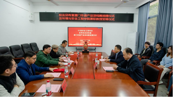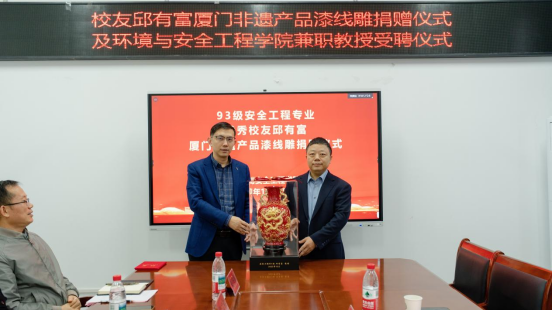 在环安楼310会议室隆重举行校友邱有富厦门非遗产品漆线雕(红五龙双耳凤尾瓶)捐赠仪式暨兼职教授受聘仪式。学院93级安全工程专业校友邱有富、欧芳明,江苏大学原副校长吴春笃、院长许晖、原安环教研室主任缪应祺、安全工程专业教师代表及学生代表共同出席仪式,仪式由学院党委副书记赵兴联主持。